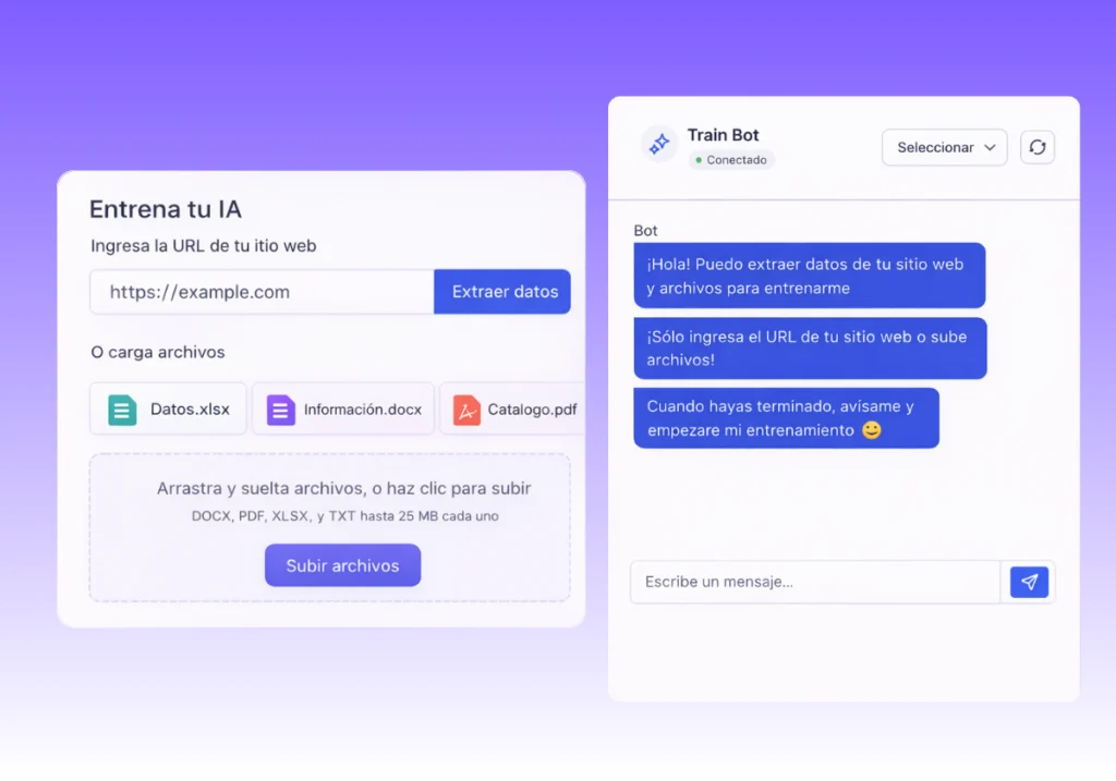 Simplemente sube tus PDF, Lista de productos/precios o pega la URL de tu web; la IA de Clientador aprenderá de tu negocio en minutos y resolverá dudas de inmediato.