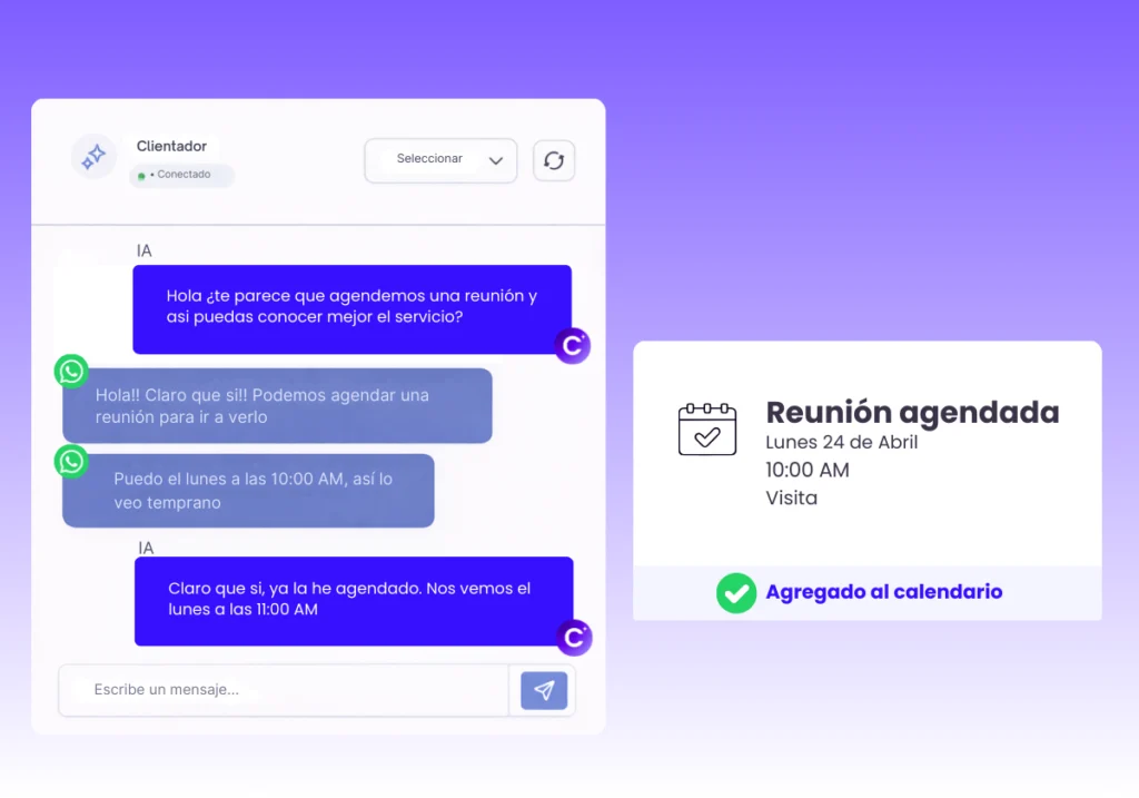 La IA de Clientador accede a tu disponibilidad y agenda reuniones directamente en tu calendario, sin fricción ni pérdida de oportunidades.